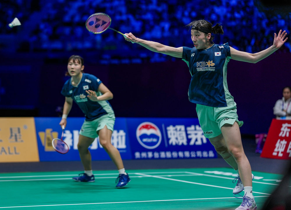 5月4日,韩国队组合白荷娜(左)/李绍希在比赛中。最终,她们在女双比赛中0比2不敌中国队组合刘圣书/谭宁。当日,在福建厦门举行的2025年苏迪曼杯世界羽毛球混合团体锦标赛决赛中,中国队3比1战胜韩国队,夺得冠军。新华社记者 孙非 摄