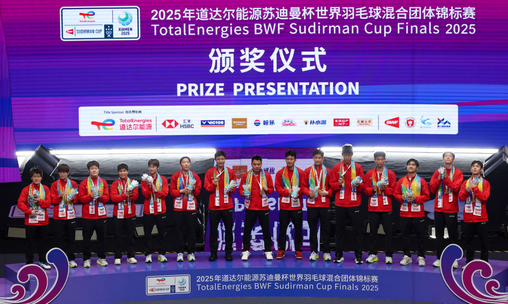 5月4日,冠军中国队在颁奖仪式上。当日,在福建厦门举行的2025年苏迪曼杯世界羽毛球混合团体锦标赛决赛中,中国队3比1战胜韩国队,夺得冠军。新华社记者 王楷焱 摄