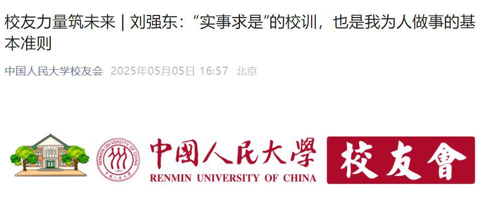 刘强东认为:" 人大给了我知识,教会了我做人的道理。可以说人大的学习经历深刻地改变了我的命运轨迹,人大 " 实事求是 " 的校训,也是我日后为人做事的基本准则。"
