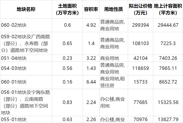 7宗地块以组合的形式出让。051-04地块、055-01地块、056-01地块、054-03地块、059-02地块、060-02地块、060-01地块占地面积3.66万平方米,地上建筑面积8.98万平方米,地下建筑面积5.11万平方米。