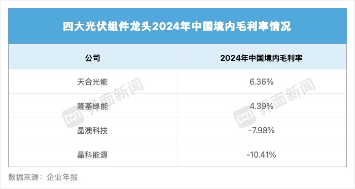 分区域看,去年晶科能源、晶澳科技在中国境内的毛利率均为负数,前者低至-10.41%,后者为-7.98%;天合光能毛利率表现最优,达到6.36%,其次是隆基绿能的4.39%。