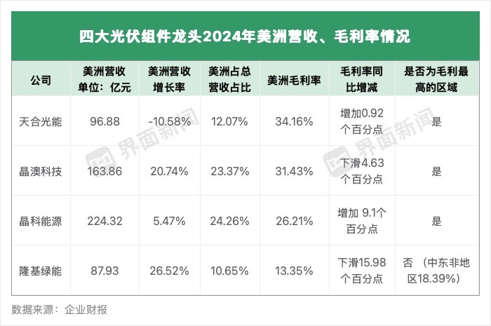 据界面新闻查询,去年四大光伏组件商在美洲地区的毛利率普遍较高,在中国境内的毛利率则均处于较低水平。