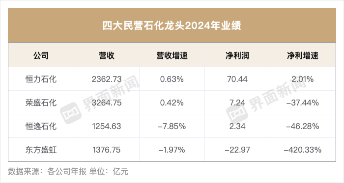 四大民营石化公司2024年业绩均出炉,呈现“一亏一涨两跌”的局面。
