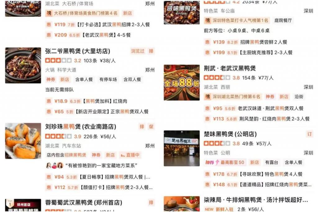 比如,原本在武汉经营烧鸭煲的 " 三板斧烧鸭煲 ",在门店菜单里加入了黑鸭煲单品,并将旗下多家分店改名为 " 三板斧黑鸭煲 ";还有蔡林记・湖北小馆、石灰石烧鸡公、周麻婆、羊冰冰铜锅涮肉、松哥油焖大虾等不同类型的餐饮品牌,都在门店相继上架了黑鸭煲单品。