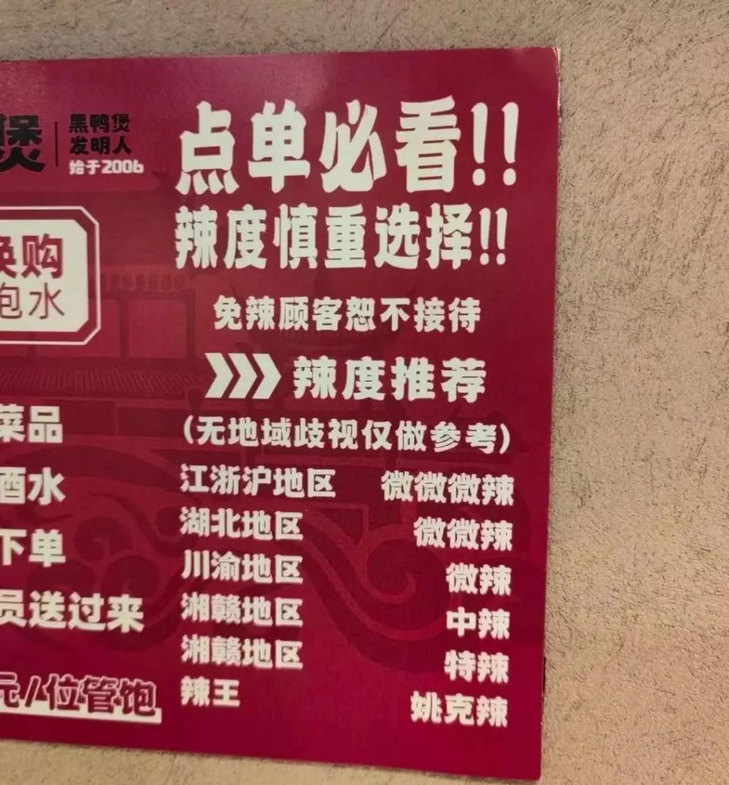 不过,相较周黑鸭,黑鸭煲还是有一些升级和改变。比如,为了让口味选择更多样,一些门店会根据地域对辣的接受度,对辣度做以区分,分成微微微辣、微微辣、微辣、中辣、特辣、辣王等多个等级。