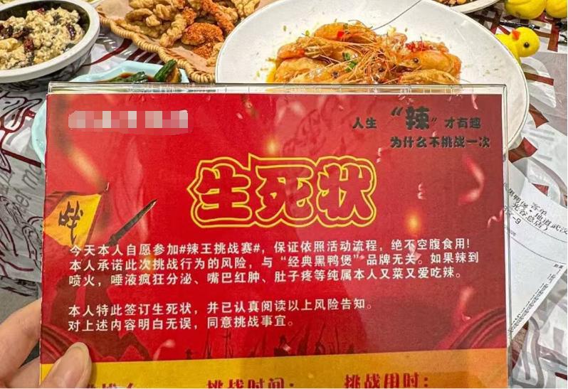 比如,某黑鸭煲品牌在门店推出了 " 辣王挑战赛 " 等活动,要求点选最高辣度的消费者签署 " 生死状 "(免责协议);还有品牌在开设城市首店时,以限时挑战最高辣度赢取现金奖励的方式吸引客流。