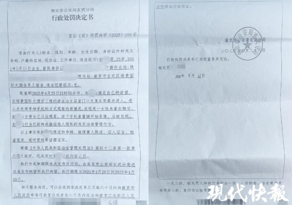 朱女士现场报了警,后经民警调查确认,偷拍她的正是前述两名工作人员中的其中一个。南京市公安局玄武区分局《行政处罚决定书》显示,当晚 9 时 50 分许,赵某在维景国际大酒店三楼的游泳池女浴室门口,反复观察并进入,先用手持手机的方式观察内部情况,发现有一女性未着衣物后,开始录像 …… 最后,赵某因偷拍他人隐私,被处以行政拘留两天。