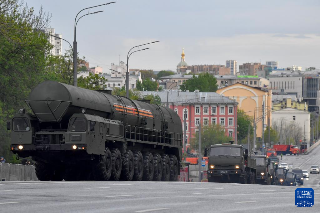 当地时间5月7日,在俄罗斯首都莫斯科,参加纪念苏联伟大卫国战争胜利80周年阅兵式彩排的车辆编队从市中心驶过。新华社记者 曹阳 摄