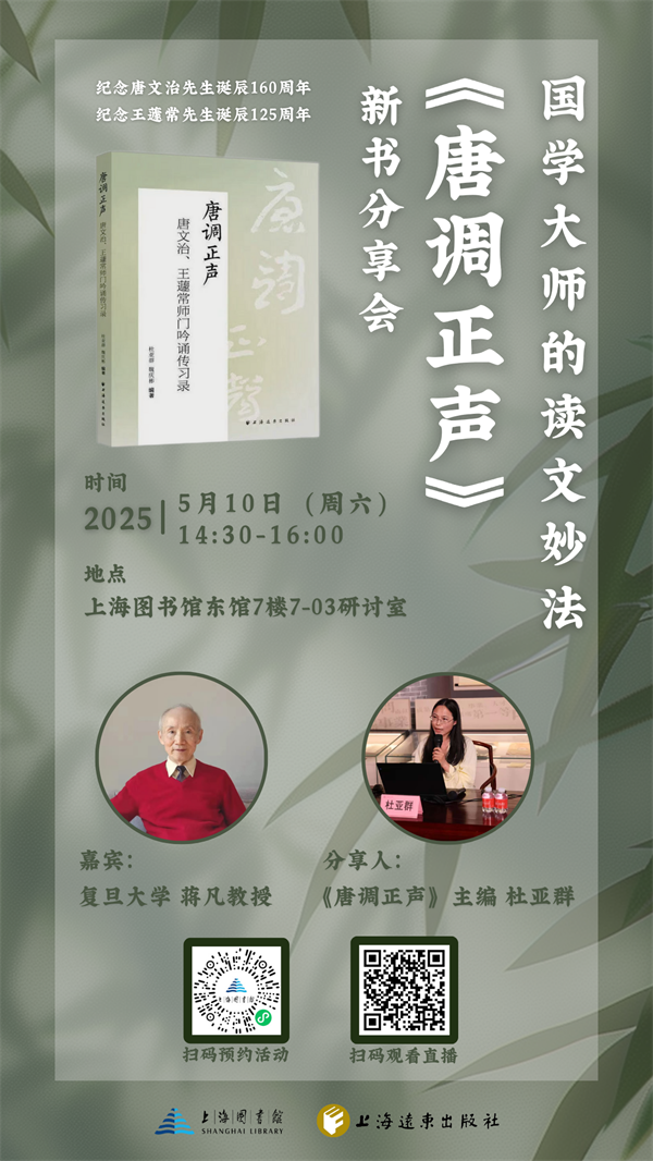 今年正逢无锡国专校长唐文治先生诞辰160周年、无锡国专教务长王蘧常先生诞辰125周年,上海远东出版社推出的《唐调正声——唐文治、王蘧常师门吟诵传习录》新书,将唐文治先生在无锡国专传授的“读文法”钩沉而出,全方位展示了“唐调”读文法广博的内涵与深刻的感染力。5月10日,全国十佳吟诵传习人杜亚群老师将携新书《唐调正声》亮相,与复旦大学中文系教授蒋凡先生、“唐调非遗保护与传承工作室”主持人赵倬成一起带我们回溯唐调的历史,聆听唐调的声音。
