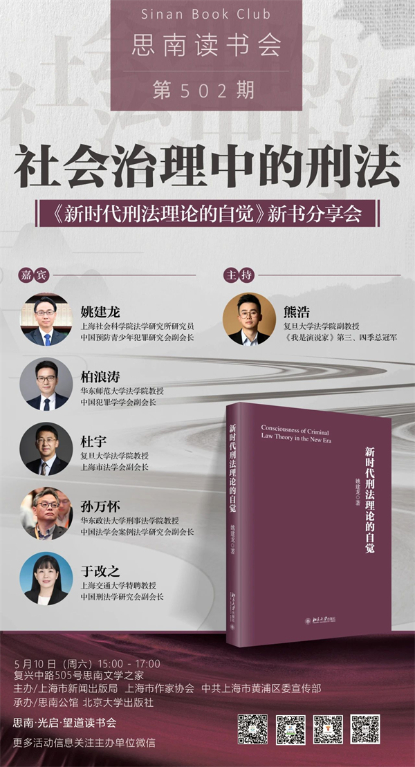 法律如何守护我们的生活?刑法在社会治理中究竟应发挥什么样的作用?很多与你我息息相关的热点问题,答案或许藏在刑法的“温度”与“智慧”中。5月10日,上海社会科学院法学研究所姚建龙研究员将携新书《新时代刑法理论的自觉》做客思南读书会,同几位与谈嘉宾一起带大众走进“硬核”刑法的世界。
