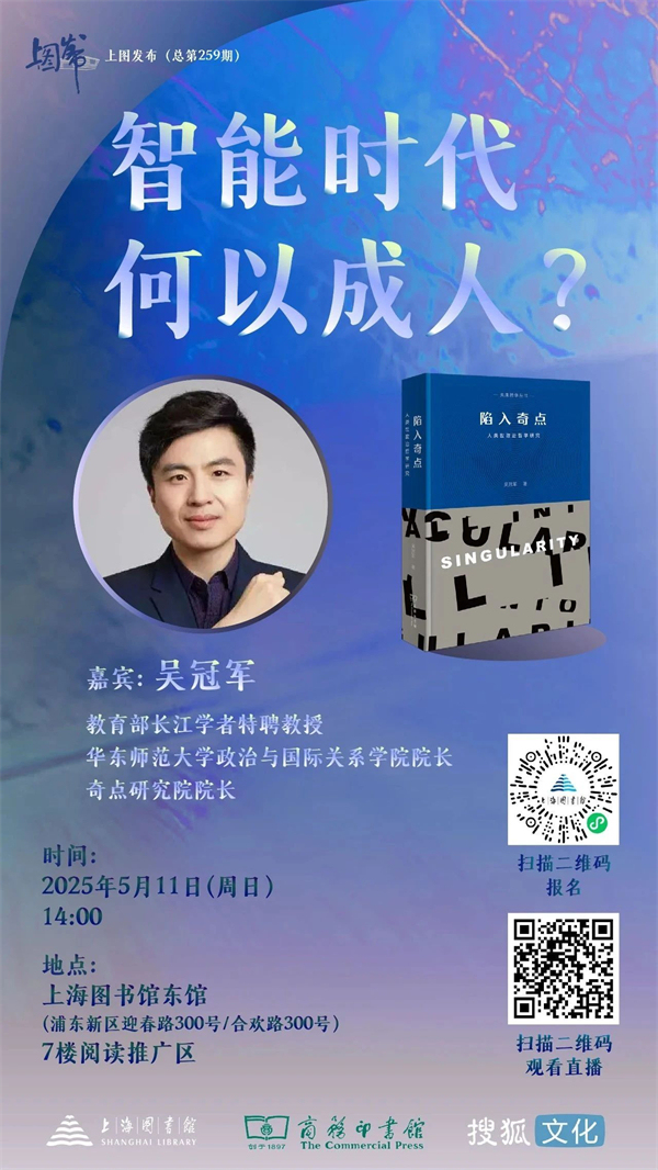在人工智能飞速发展的今天,智能工具不断刷新我们对技术的认知,它们深度融入生活的方方面面,悄然改变着我们的学习、工作与社交模式。然而,在这股智能化浪潮之下,人类的本质、价值与成长方向面临着前所未有的挑战与困惑。我们不禁要问:智能时代何以成人?为深入探讨这一时代命题,我们荣幸邀请到华东师范大学教授吴冠军于5月11日在上海图书馆东馆7楼阅读推广区展开分享。吴冠军教授在哲学、政治学与当代思想文化研究领域造诣深厚,此次分享会,他将从哲学层面探讨人类在智能技术包围下,如何坚守独特的主体性与价值观。
