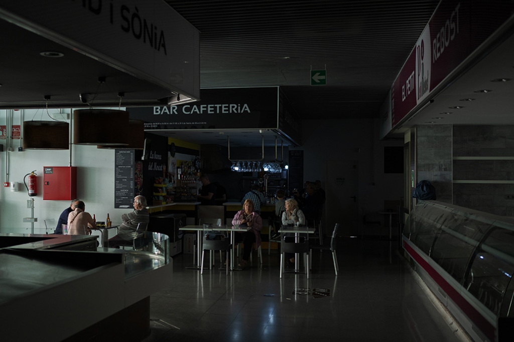 4月28日,在西班牙巴塞罗那,人们坐在一家缺乏照明的咖啡店前。