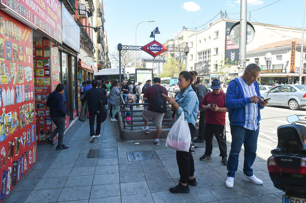 4月28日,在西班牙马德里,人们因停电地铁停运在地铁站外等候。