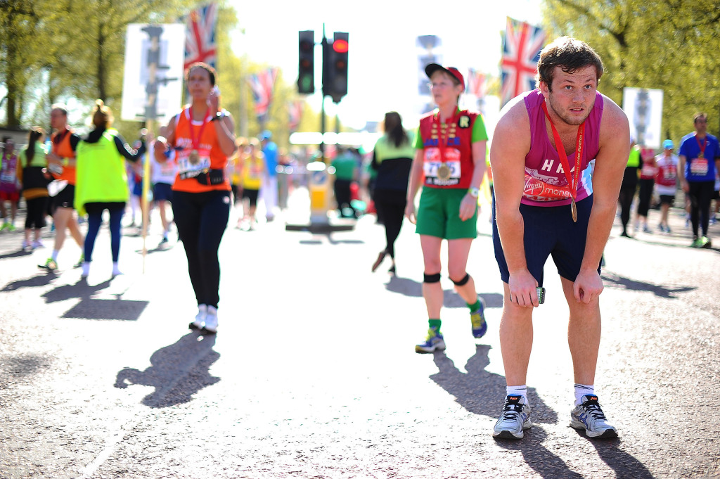 不少跑者在完赛后不自觉地就会用双手撑着膝盖休息。