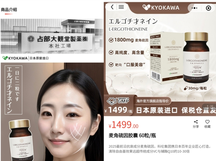 不过,根据视频号提供的小程序,在该产品的销售页面可以看到,其生产工厂为日本占部大观堂制药。这家公司位于日本福冈,是一家百年药企,该生产工厂也拥有日本荣协认定工厂GMP(Good Manufacturing Practice,良好制造规范)。另外,该产品的售价每瓶1499元/60粒,宣传标语为“2025最前沿抗衰成分麦角硫因,科伦集团携日本百年企业匠心打造,清除自由基效果远超传统成分VC与辅酶Q10的10-30倍。”
