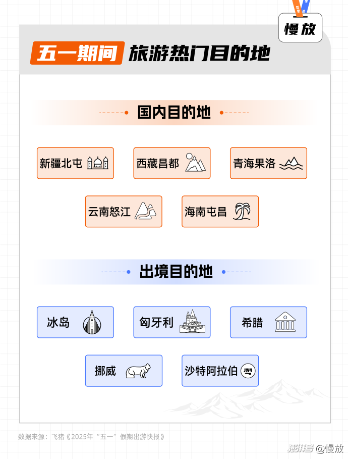 在国内,尽管北京、上海、成都、杭州等大城市持续领跑国内目的地榜单,但小城热度也不可小觑。据飞猪发布《2025年“五一”假期出游快报》新疆北屯、西藏昌都、青海果洛、云南怒江、海南屯昌等地旅游商品预订量同比去年平均增长超100%。