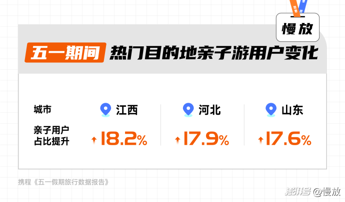 对于亲子用户来说,他们假期遛娃的小众目的地更有“文化”。携程《五一假期旅行数据报告》显示,江西、河北、山东三地亲子游需求激增明显,亲子用户占比分别提升18.2%、17.9%、17.6%。从具体景点来看,山西平遥古城门票订单量增长翻倍,朔州应县木塔门票同比增长175%。带孩子出游、顺带能够长长见识,成为了家长的重要诉求。