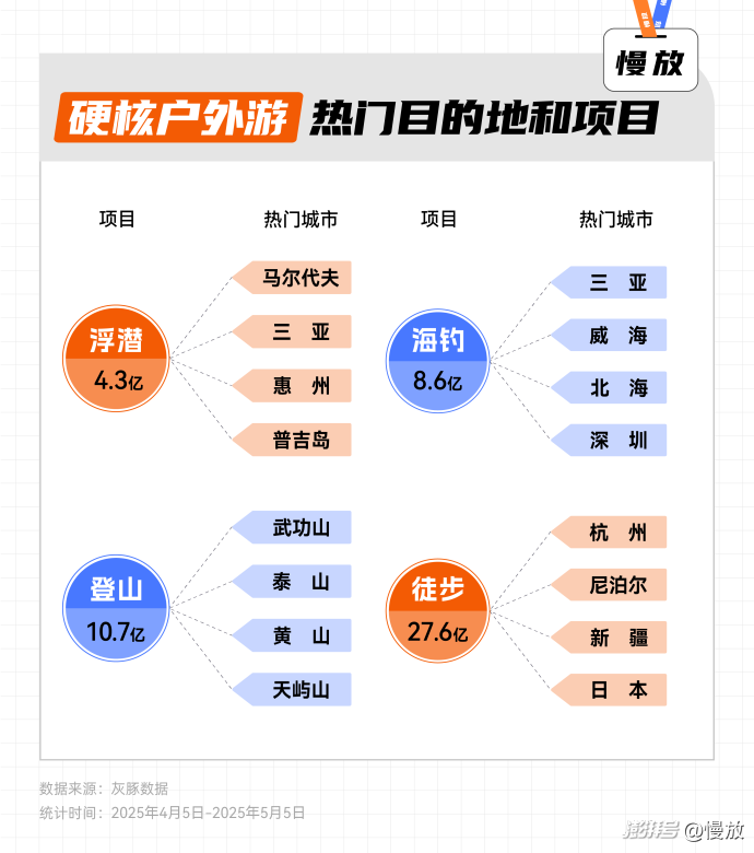 另一方面,年轻人的户外游也在变得越来越硬核。根据灰豚数据,小红书“浮潜”“海钓”“登山”“徒步”的话题浏览量分别达到了4.3亿、8.6亿、10.7亿和27.8亿。在这些话题下,国内的三亚和珠三角一线景区成为了海边项目户外游的热门区域。而在山系运动中,除了经典的武功山、泰山、黄山等地,江浙沪区域,尼泊尔、新疆、日本都开始成为新的户外旅游热门地。