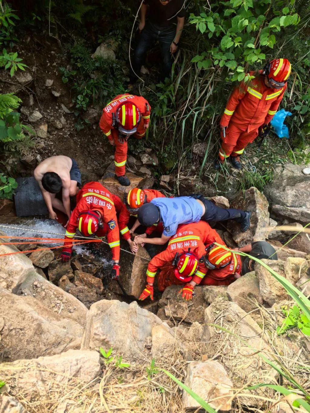 消防员说起初被困的有两个小朋友,都是随父母来千岱坑附近玩水避暑的,路过溪流旁就下到底下捡石头。没想到突然遇到滚落的碎石,无处可躲的他们被压在了碎石下。" 其中一个男孩被压的情况不严重,我们到之前就被附近群众合力救了出来。"