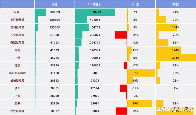 发布销量的车企都实现了同比增长,其中有四家车企同比翻番式增长,另有三家车企增速超过50%,车企的淘汰线越划越高。车企的分化依然在继续,4月车企销量排名较上月几乎没有变化,头部车企的同比增速明显更快。