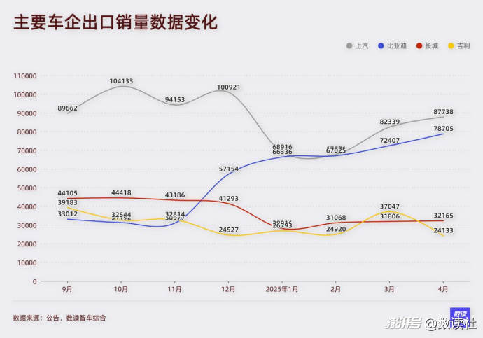 虽然比亚迪还是无可争议的龙头,但其他车企的追赶势头非常明显。4月上汽和吉利销量已经超过10万台,再加上偶尔破10万台的奇瑞和长安,目前10万俱乐部的队伍已经越来越壮大。