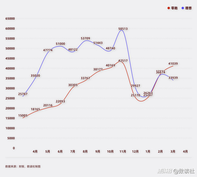 与此同时,车型单一、不进行价格下探的理想则始终难以有新的销量突破,去年年底逼近6万台后,理想便没能再度逼近这个数据。