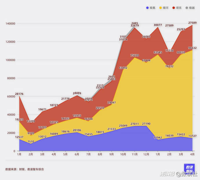 4月,极氪销量13727台,销量稳定过万。不过,与吉利的其他车型相比,极氪的表现就略显不足。