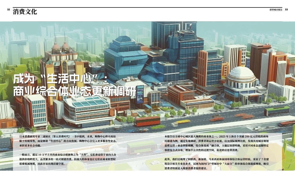 本报告以全球中心城区最大规模的商业体之一、2023年上海首个突破200亿元营收的商场环球港为例,通过实地调研,消费者和运营方访谈,以及国际案例比较,发现其用城市规划思维的运营方式。此外,还梳理了阿联酋、新加坡、马来西亚和泰国单体综合体运营经验,采访了7位建筑设计相关专业从业者,试图为国内门户型城市中“大而全”的单体综合体提质增效、吸引消费者特别是入境游消费者提供建议。