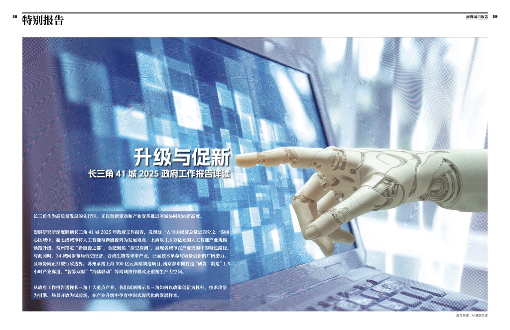 长三角作为高质量发展的先行区,正以创新驱动和产业变革推进区域协同迈向新高度。澎湃研究所深度解读长三角41城2025年政府工作报告,发现这一占全国经济总量近四分之一的核心区域中,超七成城市将人工智能与新能源列为发展重点。与此同时,34城同步布局低空经济、合成生物等未来产业,凸显技术革命与场景创新的广阔潜力,区域协同正打破行政边界。我们试图揭示长三角如何以政策创新为杠杆、技术攻坚为引擎、场景开放为试验场,在产业升级中孕育中国式现代化的发展样本。