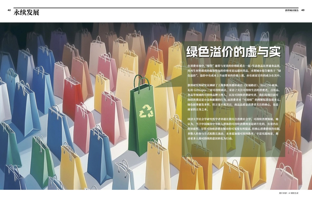 在消费市场中,“绿色”通常与更贵的价格联系在一起,本期城市报告聚焦于“绿色溢价”。我们调研了上海多抓鱼循环商店(安福路店)、HAI550商场、礼坊Gifttopia三家可持续商店,采访关注可持续生活的消费者,日用品、食品等领域的可持续品牌主理人,以及可持续消费研究者,发现目前可持续消费还是小众和新潮的行为,而消费者对“可持续”的理解标准也很多元。绿色叙事愈发多样,但万变不离其宗,商品品质是消费者关注的核心,也是商家的立身之本。