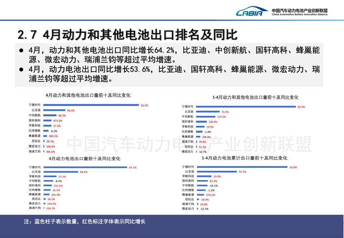 宁德时代上月动力电池出口量排在国内第一,比亚迪、孚能科技(688567.SH)依次排在第二、三位。动力电池出口量前十榜单中,增速最快的依然是国轩高科,其同比增速达到555.2%。