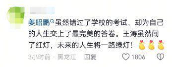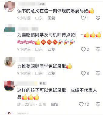 齐鲁晚报 · 齐鲁壹点相关报道视频发布后,针对此事引发不少网友热议, " 姜昭鹏虽然错过了学校的考试,却为自己的人生交上了最完美的答卷。王涛虽然闯了红灯,未来的人生将一路绿灯 "" 虽然你错过了考试,你的试卷已经是满分,赞 "" 看到这一幕想哭,曾经我也是一名出租车司机,也这样闯红灯送过乘客去医院,我能体会到当时司机真的是拿命赌 "" 他会的试卷里没有,虽然没有考试但是他们赢得了一切 "" 读书的意义在这一刻体现得淋漓尽致 "……