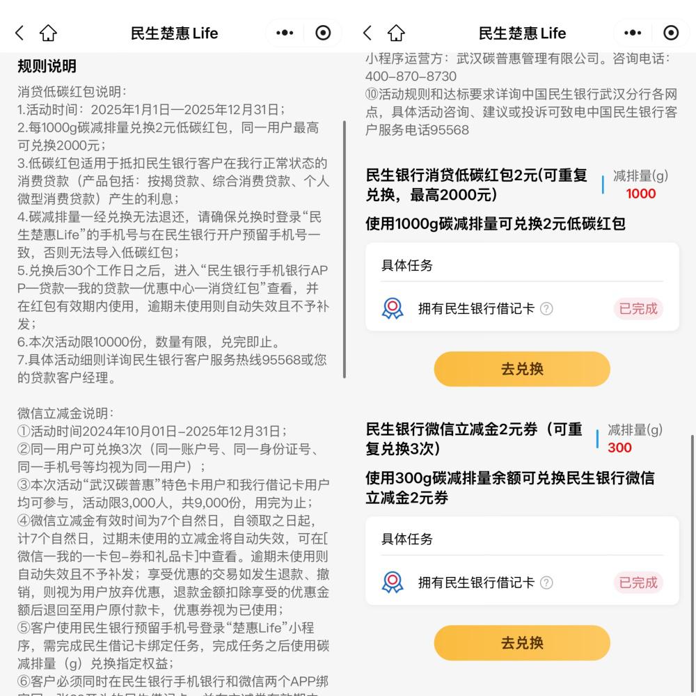 据武汉碳普惠官方公众号发布消息,4 月 28 日,全国首个个人碳普惠减排量抵扣银行贷款利息闭环在武汉落地。武汉市民可通过公共出行、垃圾分类、低碳用电等 11 类低碳场景积累碳普惠减排量,按照减排量 " 每 1000 克 =2 元 " 的标准进行积累,于 2025 年 12 月 31 日前,指定小程序实时兑换利息红包,直接抵扣按揭贷款、综合消费贷款、个人微型消费贷款利息,个人最高可兑换 2000 元。