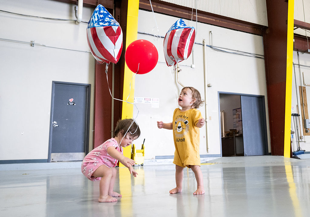 2025年5月12日,两名儿童在抵达弗吉尼亚州杜勒斯的华盛顿杜勒斯国际机场后玩气球,这是特朗普政府创建的计划的一部分,是第一批来自南非的阿非利卡人。索尔·勒布/盖蒂图片社