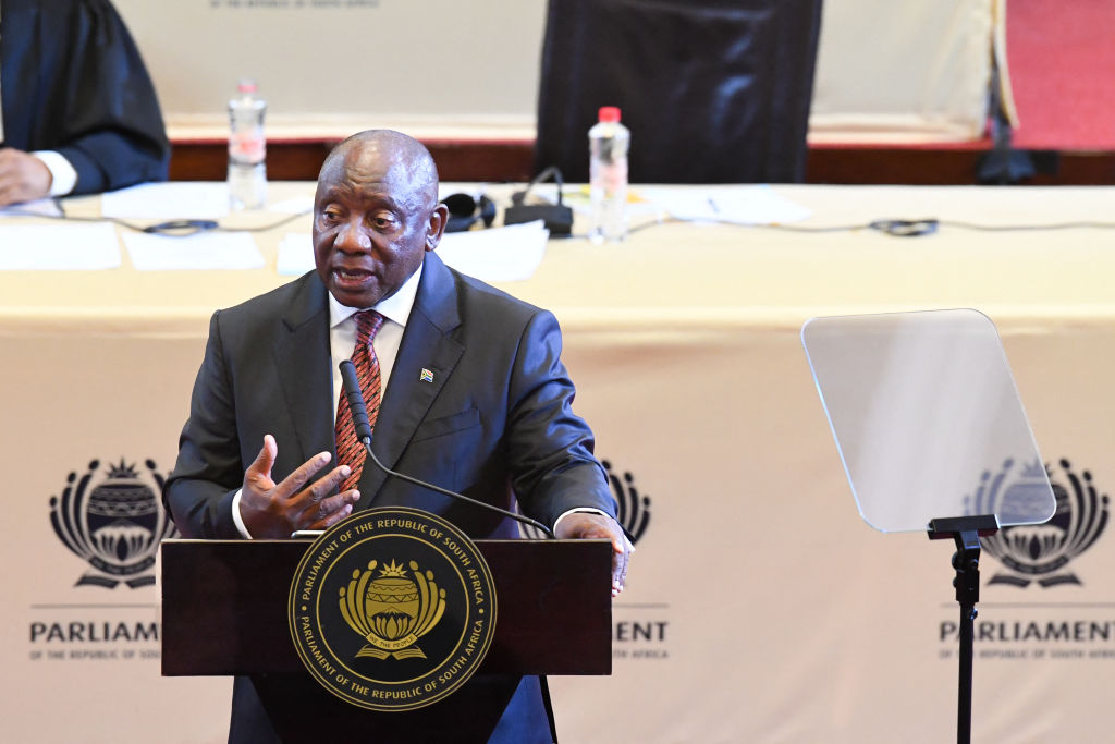 2025年2月6日,南非总统西里尔·拉马福萨在开普敦市政厅发表国情咨文演讲时做手势。罗杰·博斯/盖蒂图片社