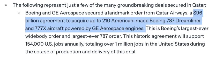 白宫表示,卡塔尔航空与波音、发动机制造商 GE 航空航天达成的协议价值为 960 亿美元,协议涉及最多210 架波音 787 梦想客机和 777X 飞机。这是波音史上最大的宽体客机订单,也是 787 机型的最大单笔订单。
