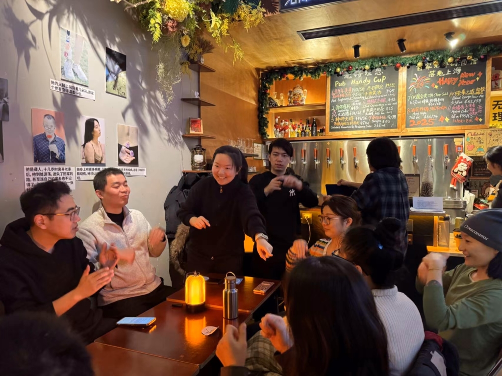 毛毛(右一)在酒馆参加活动。