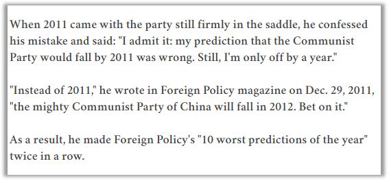 为自己找补之余,他把中国 " 崩溃 " 的时间改成了 2011 — 2012 年,并且把预测文章发表在《外交政策》上: