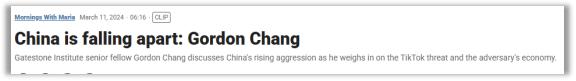 2013 年,怀揣赌徒心理的章家敦没有气馁,接受福克斯商业频道采访时,继续大胆预测:" 中国再过半年肯定崩溃!"