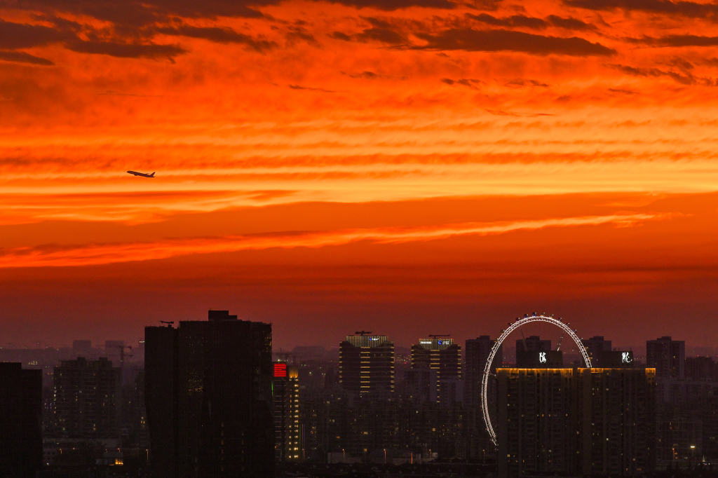 2023年7月9日,上海,一架飞机从晚霞下的锦江乐园摩天轮飞过。澎湃新闻记者 朱伟辉 资料图