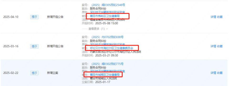 自去年开始,深圳核子华曦医学检验实验室开始陆续起诉多个地区的卫生健康管理局,主要以莆田市为主,还有一家呼伦贝尔市海拉尔区卫生健康委员会。