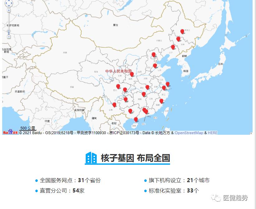 在官方宣传的业务介绍中,核子基因主要提供司法鉴定、健康管理、医学检验、科研服务的业务。官网显示的布局中," 核子基因服务网点遍布全国,并已在全国直营分公司有 54 家、33 个标准化实验室 "。