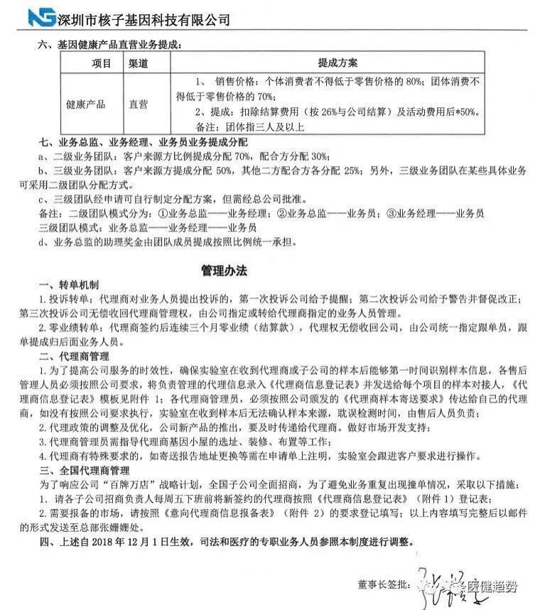 据公司官网介绍,核子基因集团成立于 2012 年,是一家集基因技术研发、市场应用于一体的高新科技型企业,分司法鉴定、医学检验、健康管理,科研服务四个板块。目前核子基因集团已经发展出了 44 个直营分公司,928 名核心代理商,565 家基因加盟小屋,并号称 " 在全国拥有 100 块基因检测牌照 "。附核子基因集团全国业务人员薪酬制度: