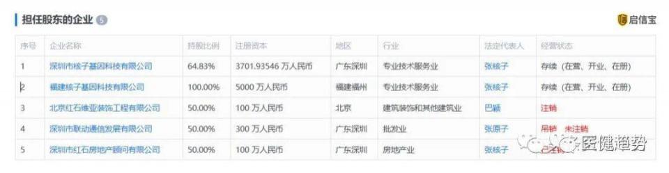 毋庸置疑,张核子的身份是核子基因集团的创始人兼总裁,但他同时还涉足了其他行业的多家公司。而在目前来看,由张核子担任股东的企业,如北京红石维亚装饰工程有限公司、深圳市联动通信发展有限公司、深圳市红石房地产顾问有限公司等多家企业都已处于吊销或注销的状态。