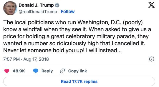 他当时还气愤地发了一条推特,炮轰称:"华盛顿特区的政客们管理得一塌糊涂,一看有捞钱的机会就眼红。当被问及举办一场盛大阅兵所需的费用时,他们竟然报出了一个高得离谱的数字,以至于我不得不取消了它。"