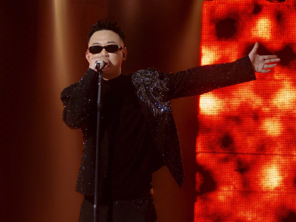 盖哥的《炁》,开口第一句就紧张了,但嘻哈歌手分分钟可以找机会向台下训话,这个小坎儿就无人觉察地掩饰了过去。大开合的歌曲,用了众多民族乐器加持,这类歌应该是越唱越顺越唱越嗨,紧张是不存在的。