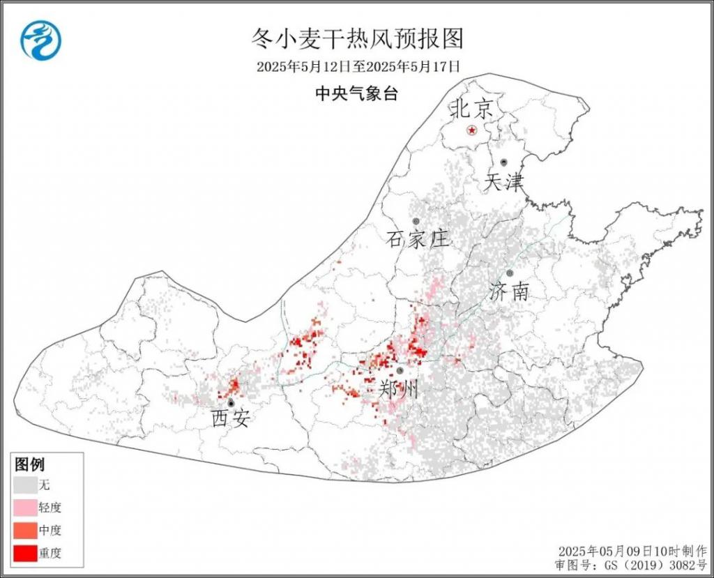 中央气象台预报显示,河南安阳、焦作、新乡、洛阳、郑州、许昌,陕西关中,河北邯郸,山西运城、临汾等地将出现轻至重度干热风天气,主要影响时段为 12 日、15 至 17 日