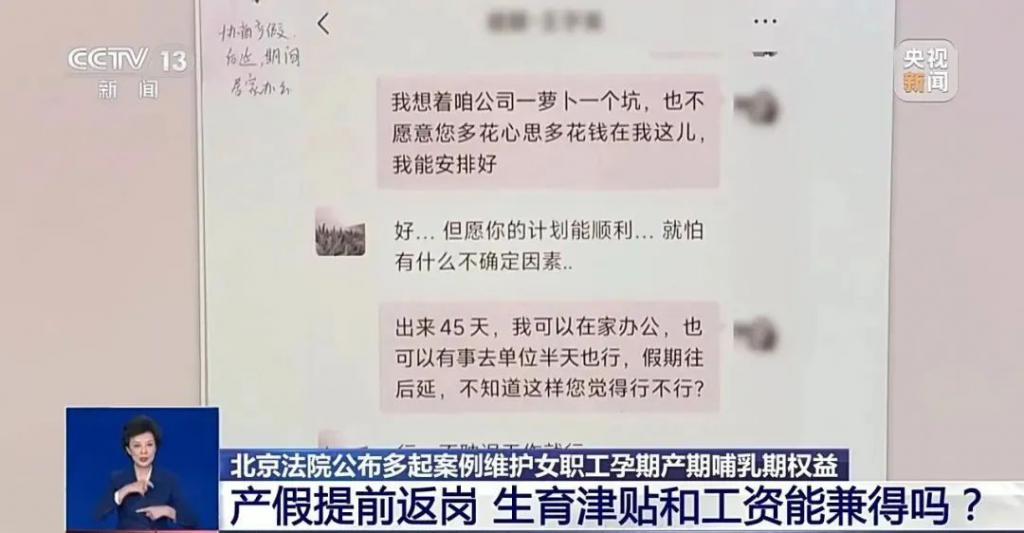 刘女士在怀孕生产前一个月左右时,与公司法定代表人王某就产假事宜进行微信沟通:" 生产 45 天后,我可以在家办公,有事去单位半天也行,假期往后延,不知道这样您觉得行不行?"