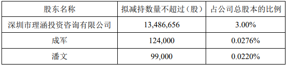 其一是控股股东、实际控制人邱光的一致行动人理涵投资,持股数量1,600万股,占公司总股本的3.56%。其计划减持不超过1,348.67万股,占比不超过3%。