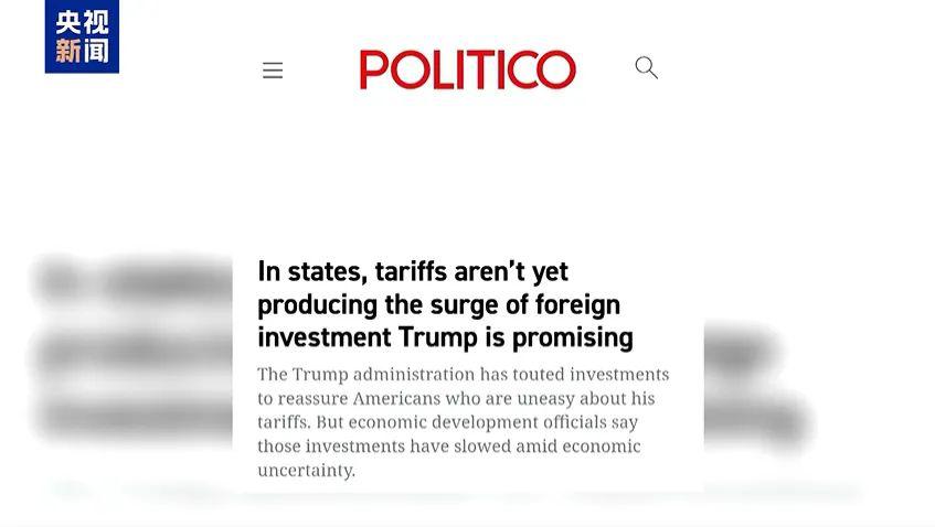 据央视新闻报道,当地时间 18 日,美国《政治报》网站发表题为《在美国各州,关税并未带来特朗普所承诺的外国投资激增》的文章。